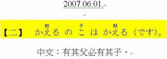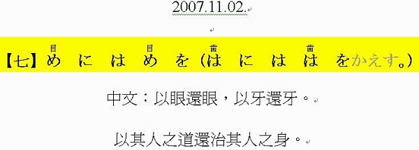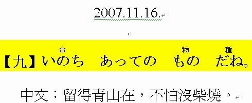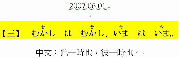 昨天手比較不疼了,正好把這兩期日文課老師所教過的日文諺語重新整理一下,就當作複習吧,因為老師上週五說:"學期要結束了,我們來個整理,把以前教過的こどわざ通通複習一遍.班代一直點頭,表示她都有在整理,那我們就請班代下次上課把它印出來..."