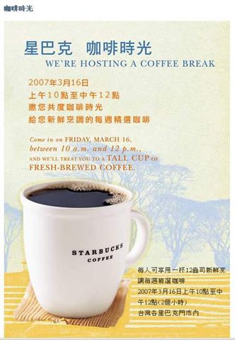 於台灣各星巴克門市內可免費享用一杯12盎司新鮮烹調的每週精選咖啡。