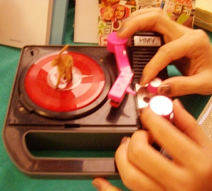 她為我們示範小唱盤的玩法,不過,這台機器已經被其他客人玩掛,只能發出唧唧嘎嘎的聲音,但是,看著HMV出產的這台小機器,不得不佩服日本人啥小玩意兒都可發明的點子.