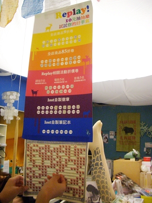 除了兩枚手工徽章外,我們還中了一本手工製筆記本以及幾張85折優惠券,當然好心又美麗的狗皮"姐姐"讓我兒子又多抽了2支,所以,中獎率有比較高啦.^0^