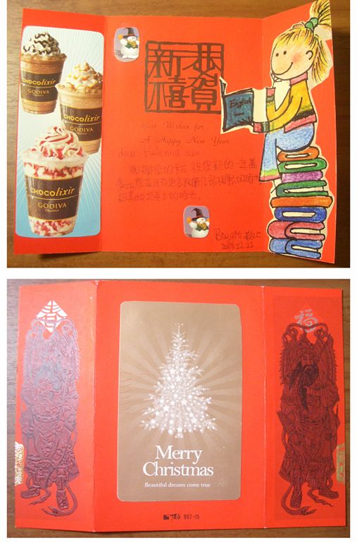 兩天前,把卡片掛號寄出的那個早上,才發現:副總筒Helenna放耶誕大假,返回高雄和妍及昂團聚了.(所以,副總筒還是會比其他人晚看到卡片.)想說掛號一定是本人親自拿到的,不會是同事先看到.然而...,這叫人算不如天算嗎?+++