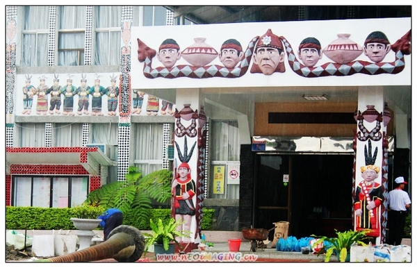 獅子鄉圖書館壁面上也有浮雕,設色豔麗,即使雨天仍不掩其光彩.