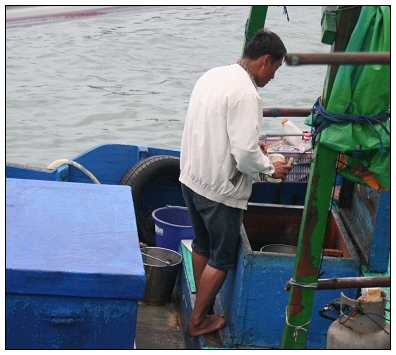 釣客自在的漁港邊釣魚,右邊那名男子就是賣醃桃子老闆娘的老公.