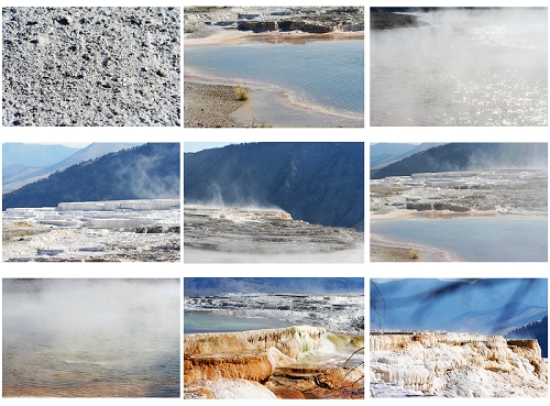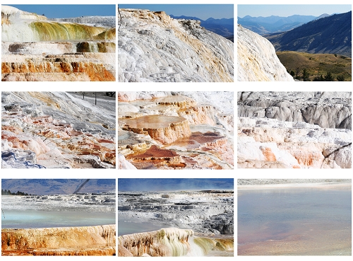 感覺上和昨天看到的"上帝之眼(GRAND PRISMATIC SPRING)"非常相似.石灰岩中的碳酸鈣被地熱融出沉積後,因繁衍了許多藻類而有了各種顏色,十分美麗.白色石梯田所融出的碳酸鈣因地熱溫度高,無法繁殖藻類,故仍保持純白的樣貌.